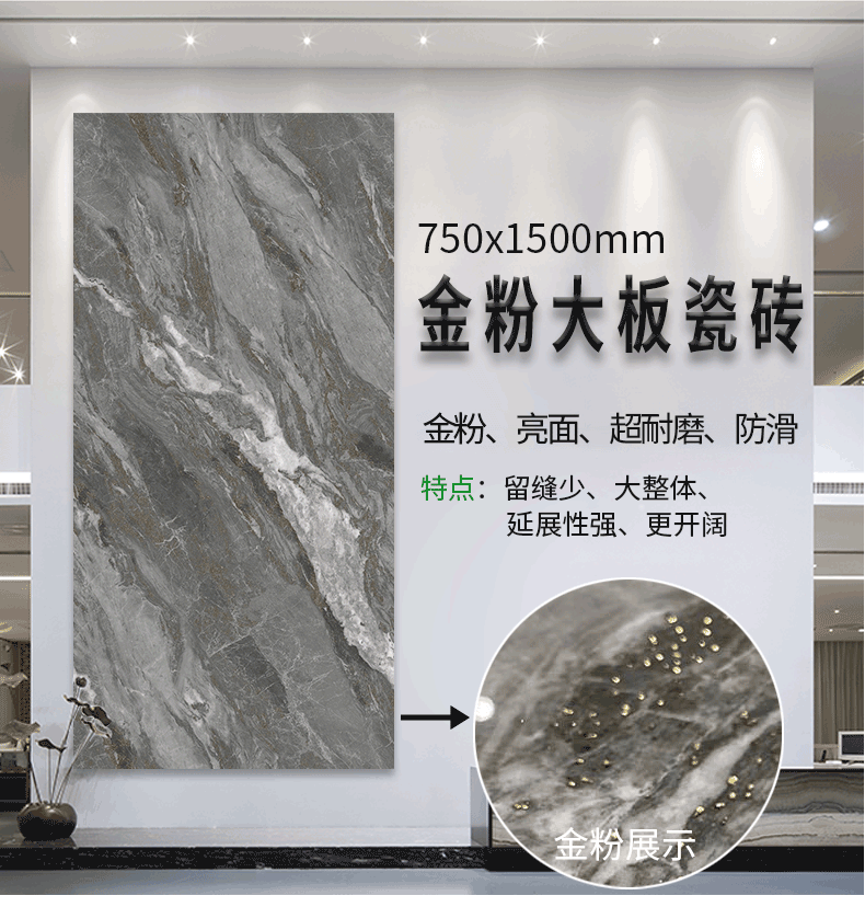 金線金粉 【產(chǎn)品介紹】航天級(jí)激光鍍金工藝,鉆石雕刻技術(shù),高溫慢燒,釉層不吸污吸水率低,真空鍍金燒成后再進(jìn)行真空電鍍工藝,平整如鏡面,精拋細(xì)磨,磚面平整光滑細(xì)膩光澤度、亮度、硬度較高。立體紋理,釉下彩工藝,三次淋釉增加磚面的立體感。