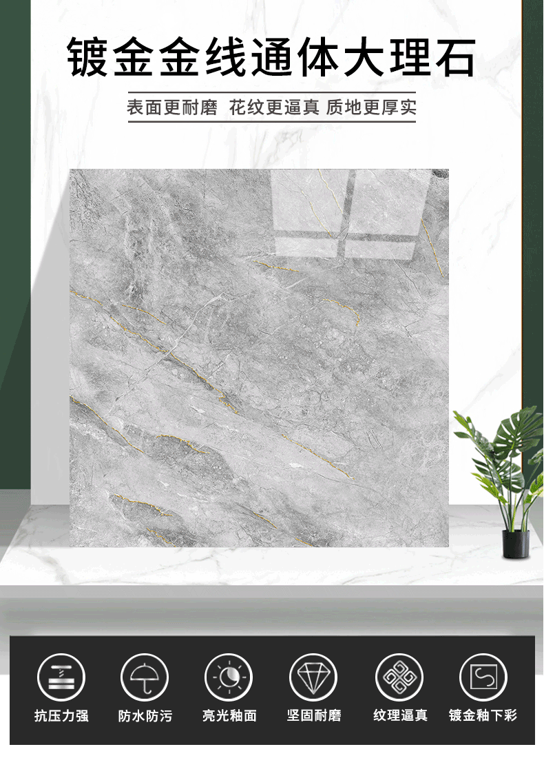 金線(xiàn)金粉 【產(chǎn)品介紹】航天級(jí)激光鍍金工藝,鉆石雕刻技術(shù),高溫慢燒,釉層不吸污吸水率低,真空鍍金燒成后再進(jìn)行真空電鍍工藝,平整如鏡面,精拋細(xì)磨,磚面平整光滑細(xì)膩光澤度、亮度、硬度較高。立體紋理,釉下彩工藝,三次淋釉增加磚面的立體感。