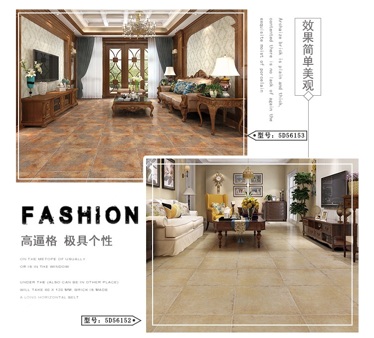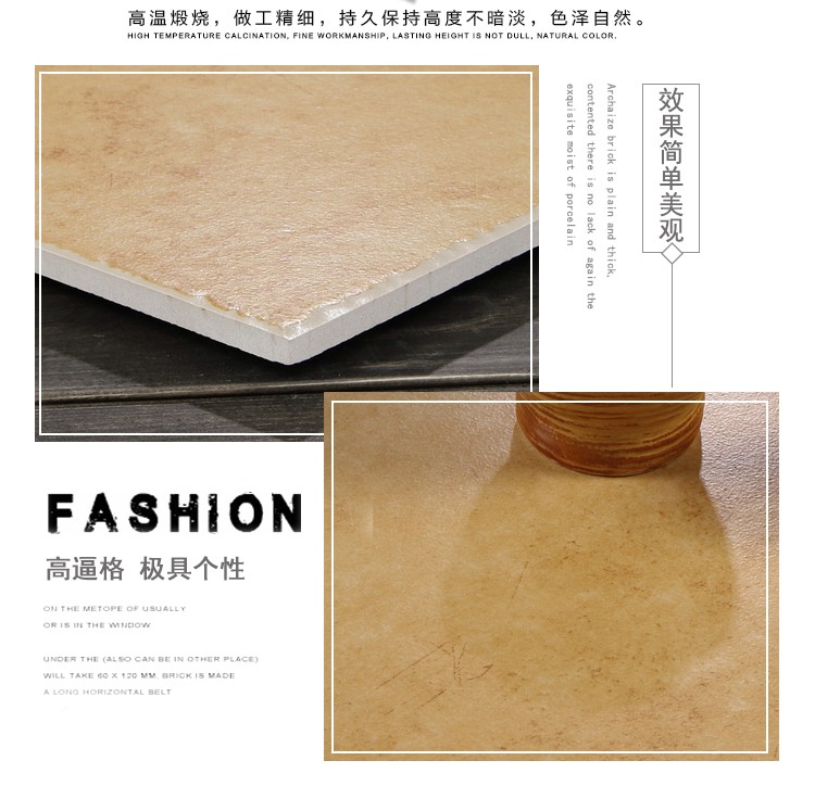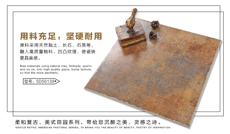 金曼古仿古地磚,采用國際先進的超大型壓機自動成型,經世界一流的滾筒印花和高溫煅燒而成,通過仿石、仿巖、仿木、仿布、仿金屬等多種表現方式,產品花色圖案新穎時尚,領先國際潮流,具有超耐磨、防滑、防污等高性能指標。
