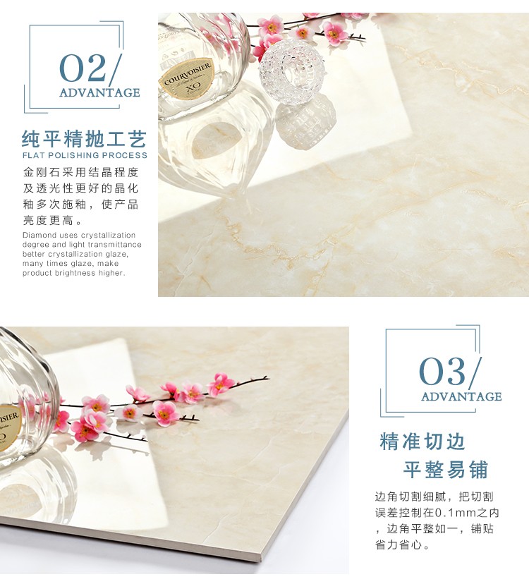 金曼古全拋釉瓷磚運用多層特殊制造工藝,將全透析釉料下彩技術結合先進印刷工藝,令花紋俯在下層,低碳能源、清潔生產,表面光潔剔透,獨有釉料精拋工序,集拋光磚與仿古磚優(yōu)點于一體,釉面如拋光磚般光滑亮潔,同時其釉面花色如仿古磚般圖案豐富,色彩厚重或絢麗。