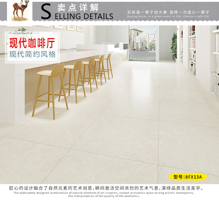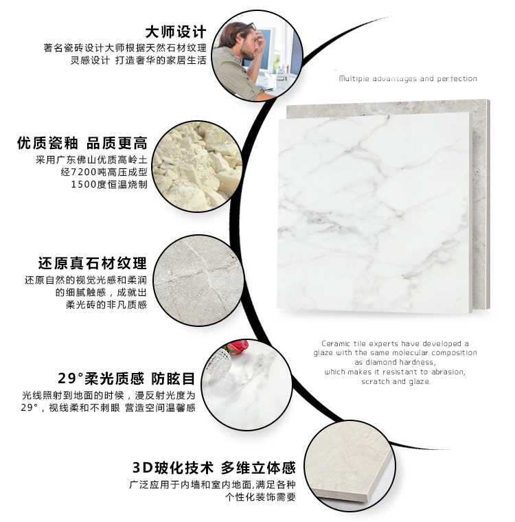 柔光瓷磚是磚面反射介于強(qiáng)光與弱光之間的一類瓷磚,其結(jié)合亮光類瓷磚的高調(diào)明艷裝飾和啞光類瓷磚的低調(diào)內(nèi)斂搭配效果,通過(guò)動(dòng)態(tài)柔光蠟拋技術(shù),降低產(chǎn)品反光率,從而達(dá)到人體舒適的視覺感受以及無(wú)光污染的空間裝飾效果。優(yōu)點(diǎn):1.視覺舒適,無(wú)光污染 2.堅(jiān)固耐磨,不易刮花.