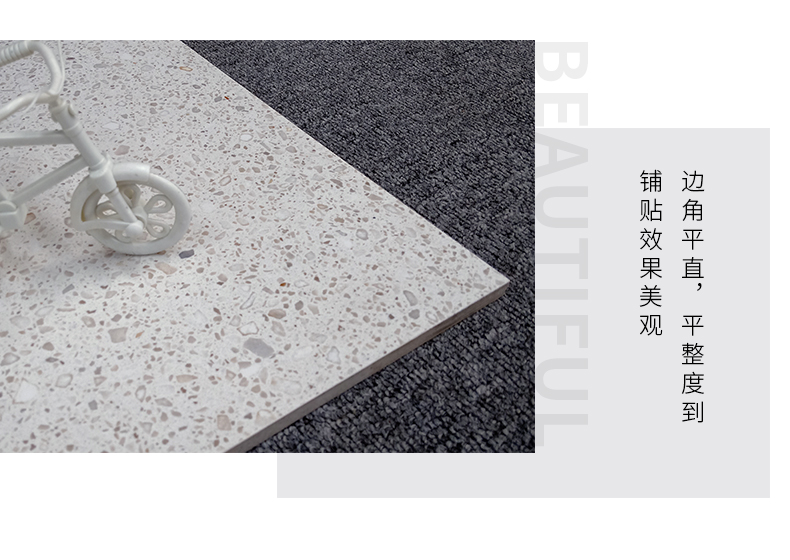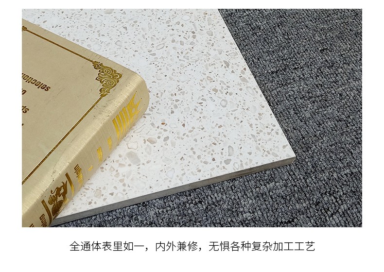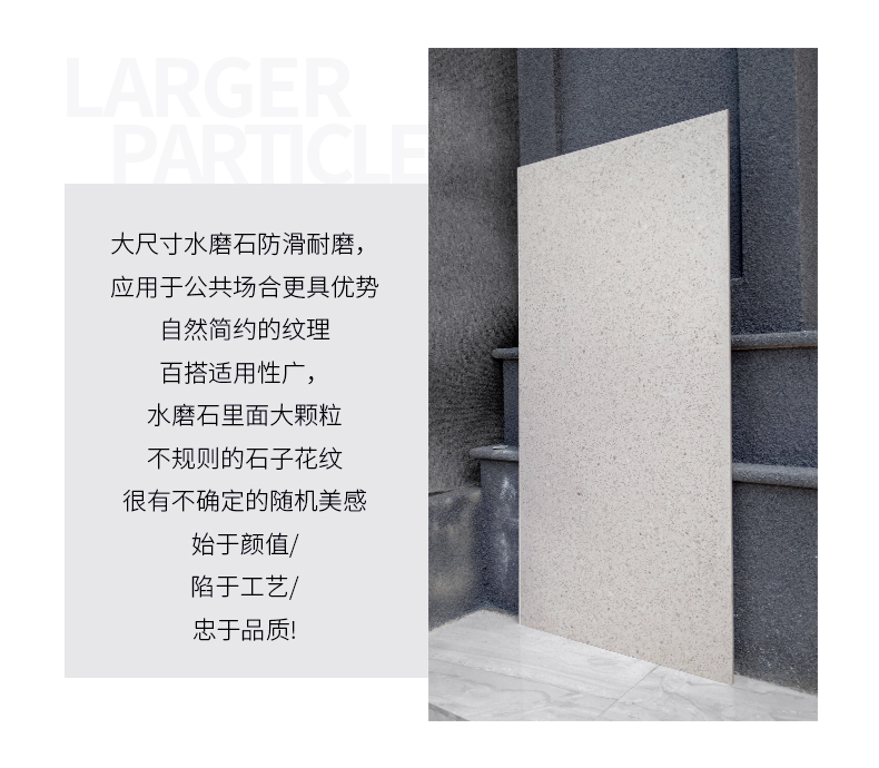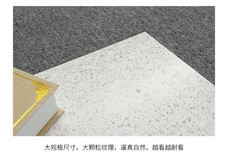 大尺寸水磨石防滑耐磨,應(yīng)用于公共場合更具優(yōu)勢,自然簡約的紋理,百搭適用性廣,水磨石里面大顆粒,不規(guī)則的石子花紋,很有不確定的隨機美感。始于顏值/陷于工藝/忠于品質(zhì)!