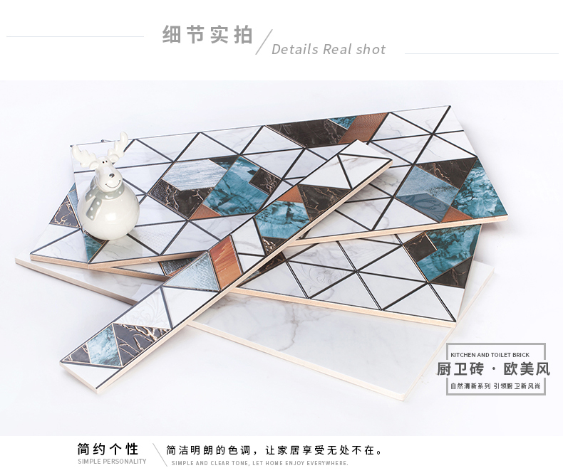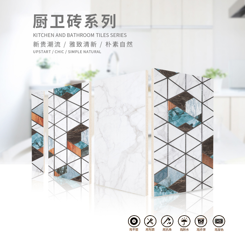 適用于洗手間、廚房、室外陽(yáng)臺(tái)的立面裝飾,是保護(hù)墻面免遭水濺的有效途徑。它們不僅用于墻面,用在門(mén)窗的邊緣裝飾上,也是一種有趣的裝飾元素。用于踢腳線處的裝飾墻磚,既美觀又保護(hù)墻基不易被鞋或桌椅凳腳弄臟。