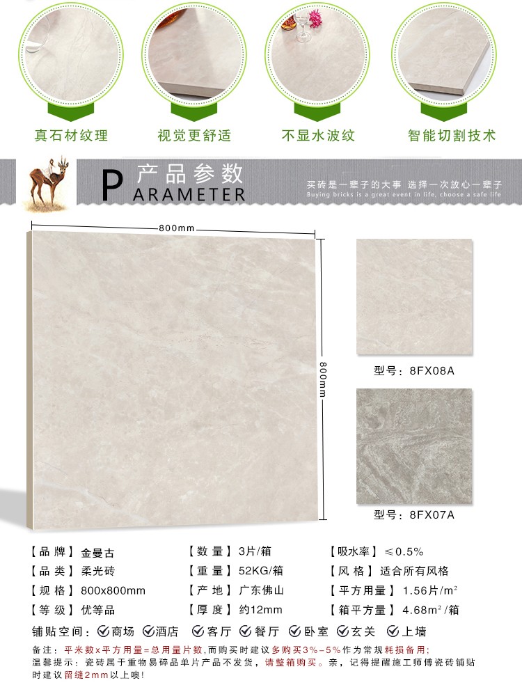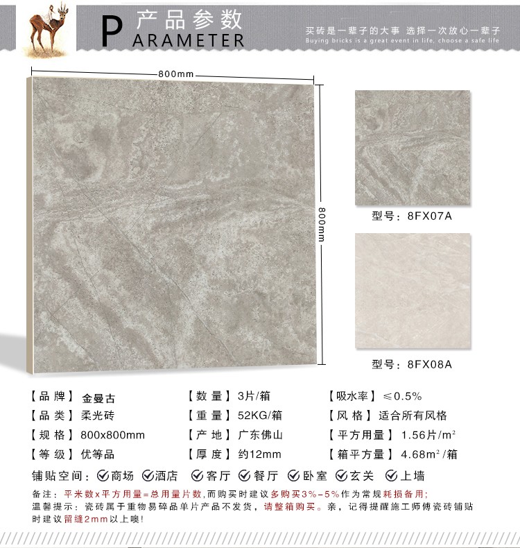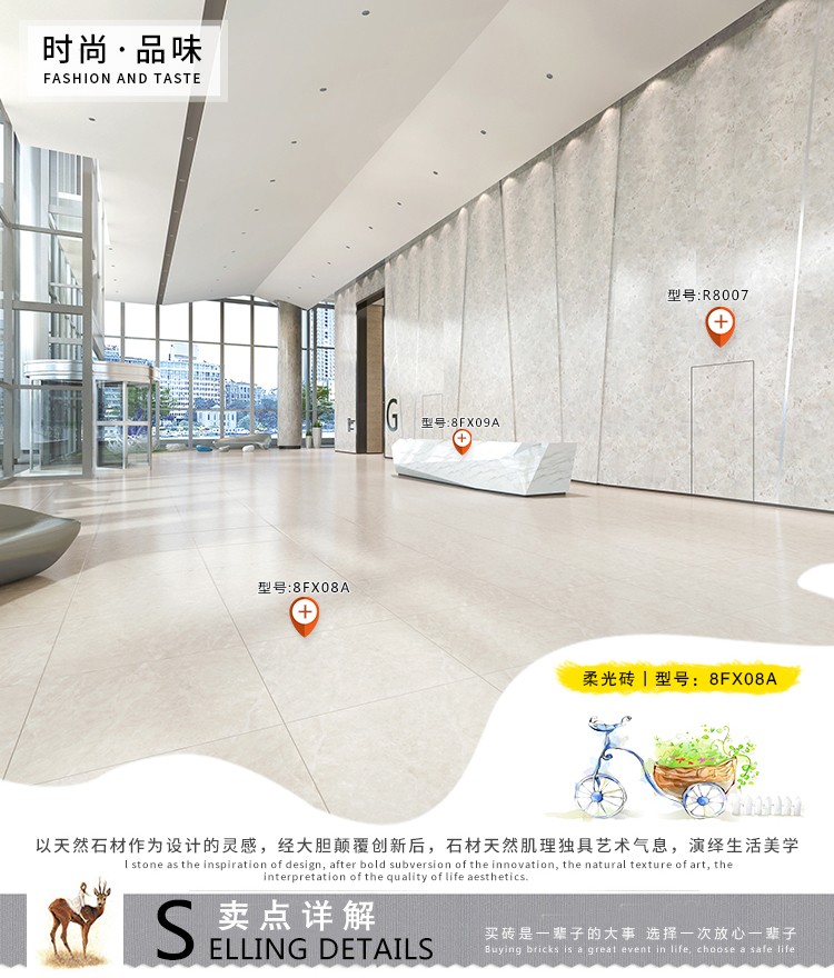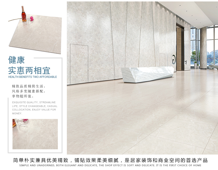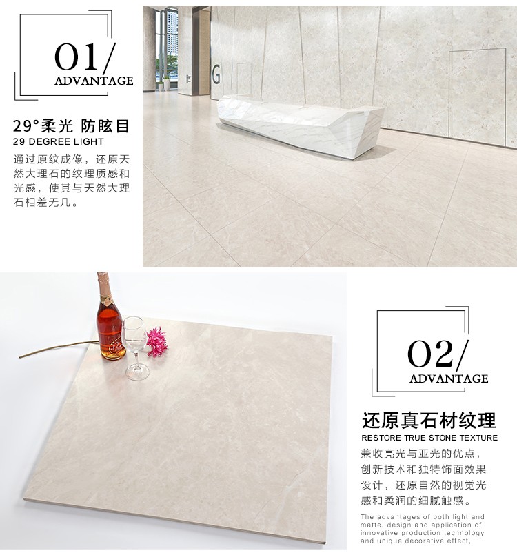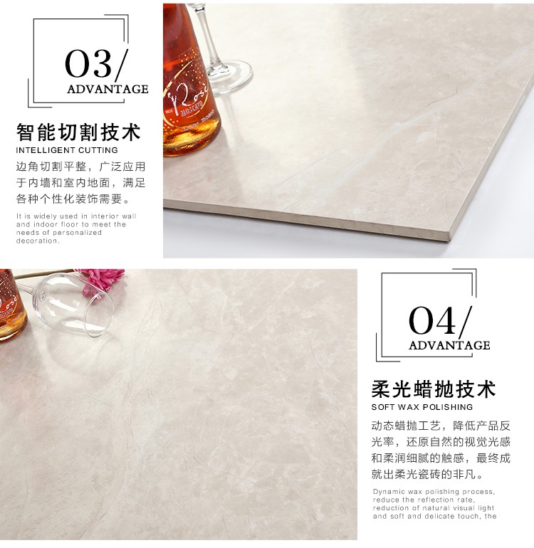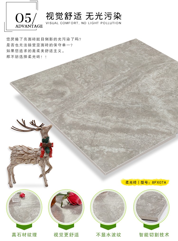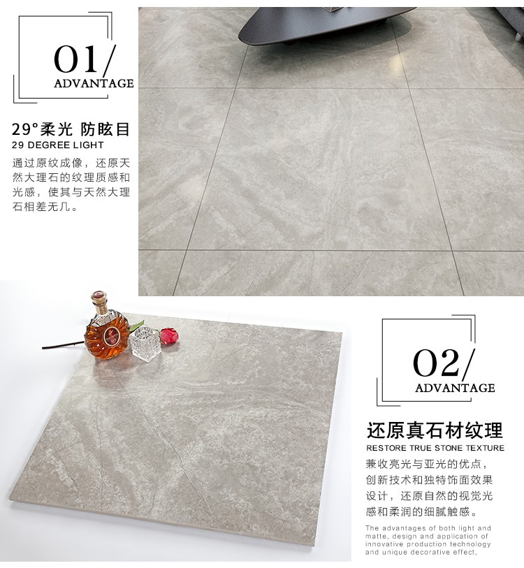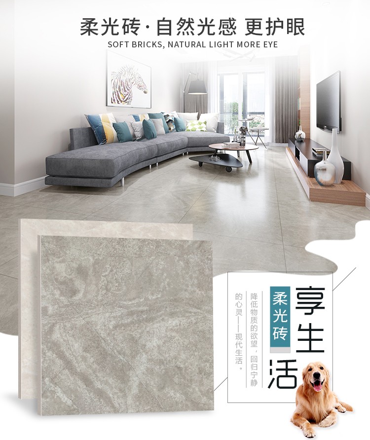 柔光瓷磚是磚面反射介于強(qiáng)光與弱光之間的一類瓷磚,其結(jié)合亮光類瓷磚的高調(diào)明艷裝飾和啞光類瓷磚的低調(diào)內(nèi)斂搭配效果,通過(guò)動(dòng)態(tài)柔光蠟拋技術(shù),降低產(chǎn)品反光率,從而達(dá)到人體舒適的視覺(jué)感受以及無(wú)光污染的空間裝飾效果。優(yōu)點(diǎn):1.視覺(jué)舒適,無(wú)光污染 2.堅(jiān)固耐磨,不易刮花.