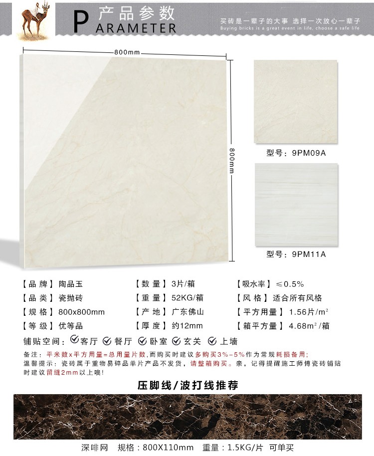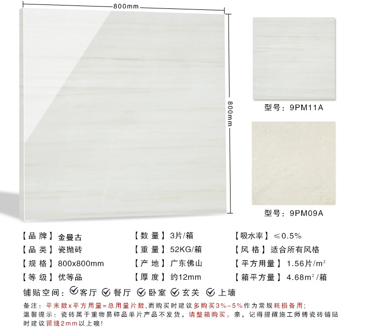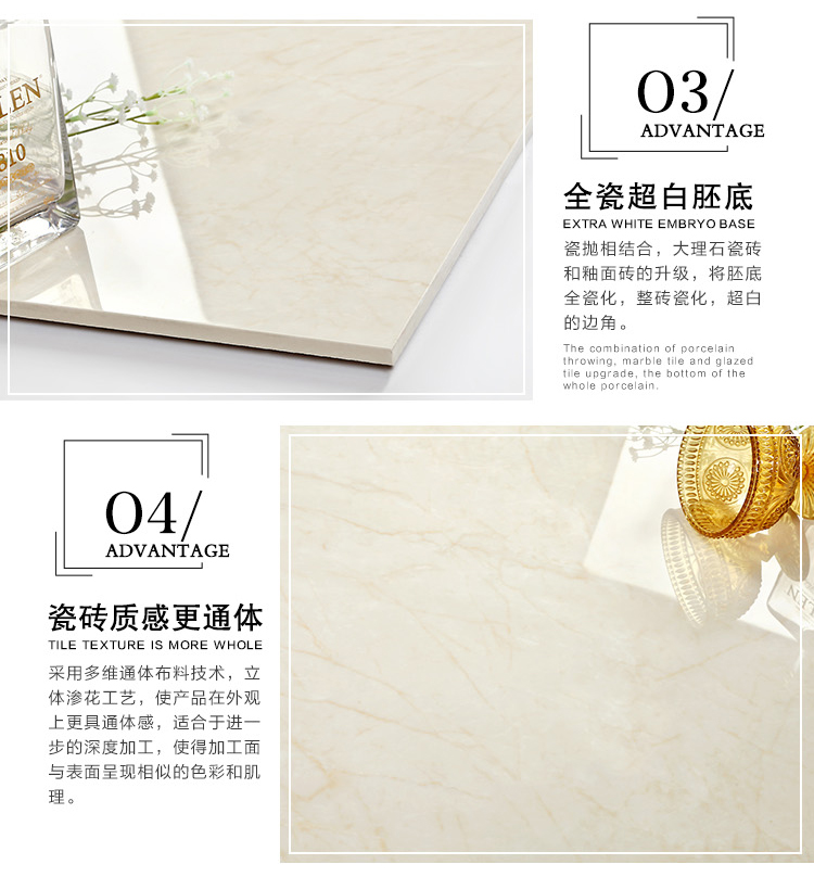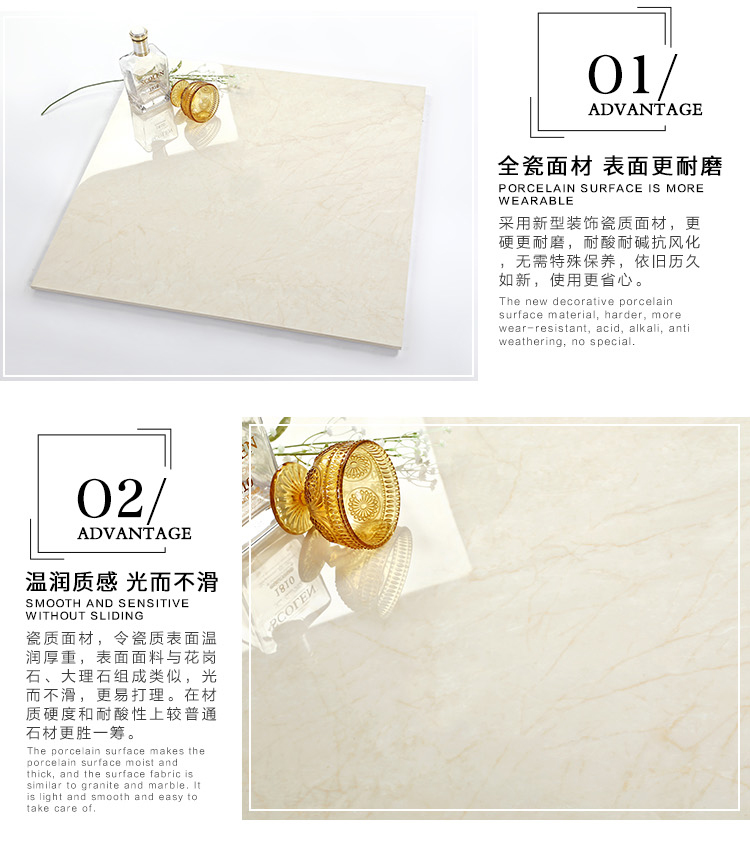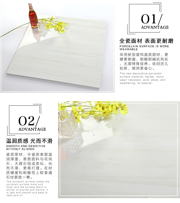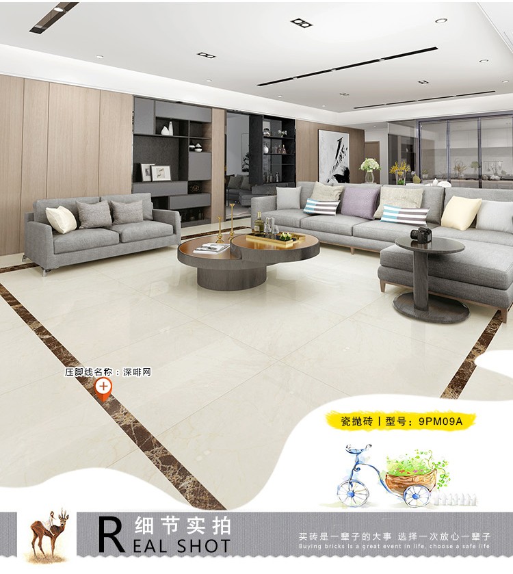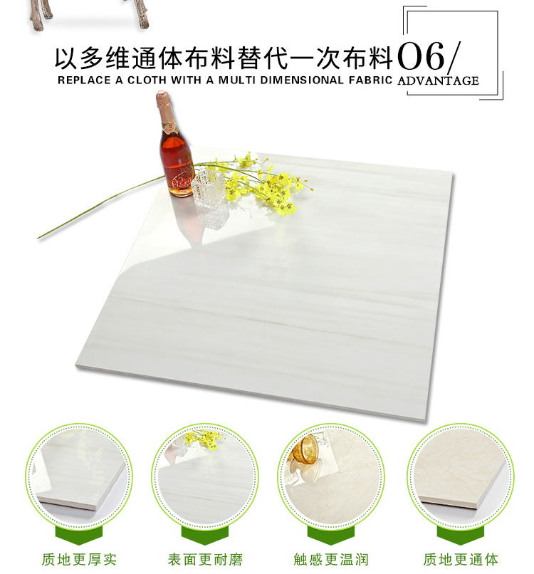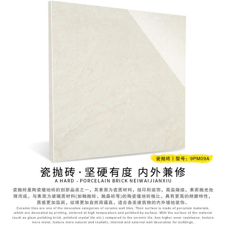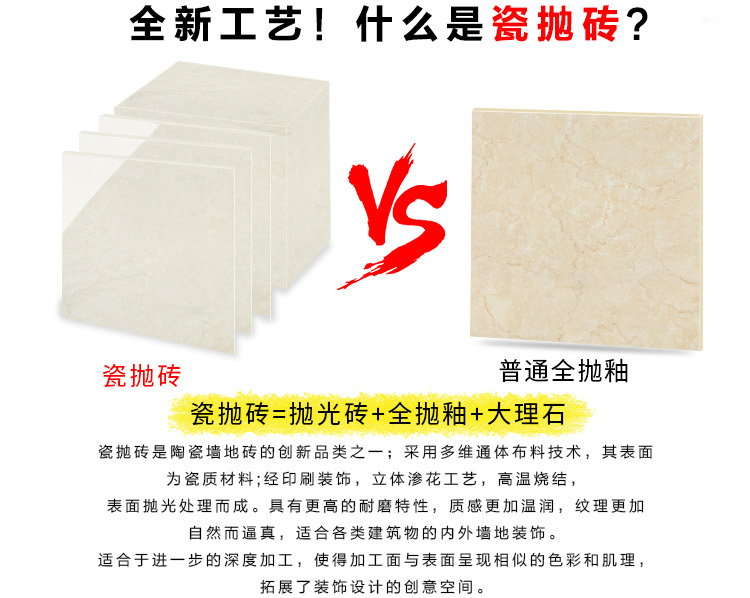 瓷拋磚,是陶瓷墻地磚的創(chuàng)新品類之一,其表面為瓷質(zhì)材料,經(jīng)印刷裝飾,高溫燒結(jié),表面拋光處理而成。與表面為玻璃質(zhì)材料的陶瓷墻地磚相比,具有更高的耐磨特性,質(zhì)感更加溫潤,紋理更加自然而逼真,適合各類建筑物的內(nèi)外墻地裝飾。