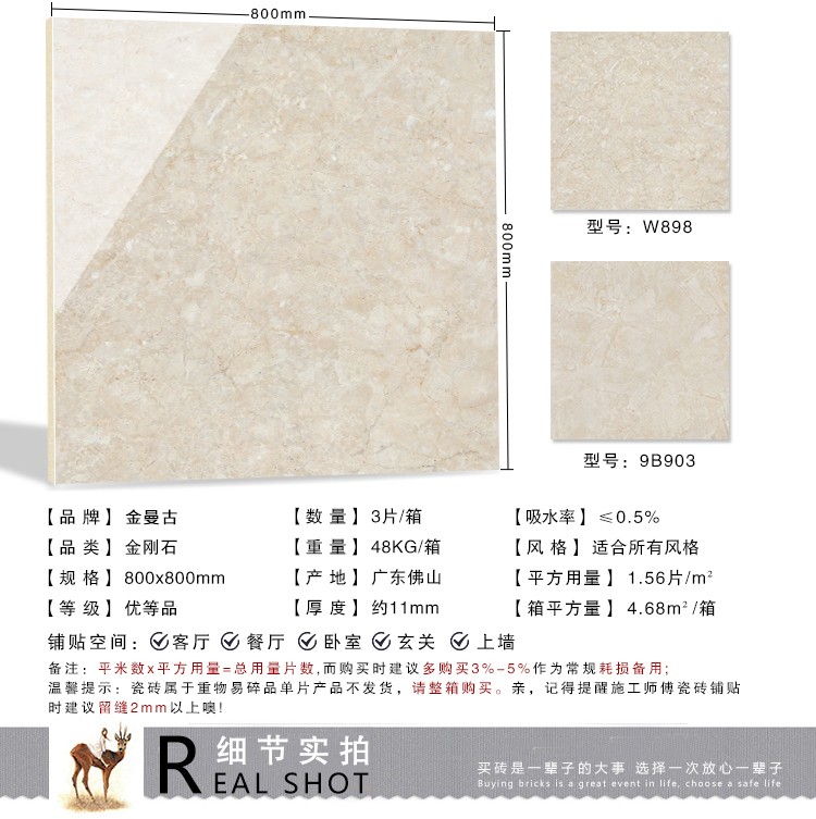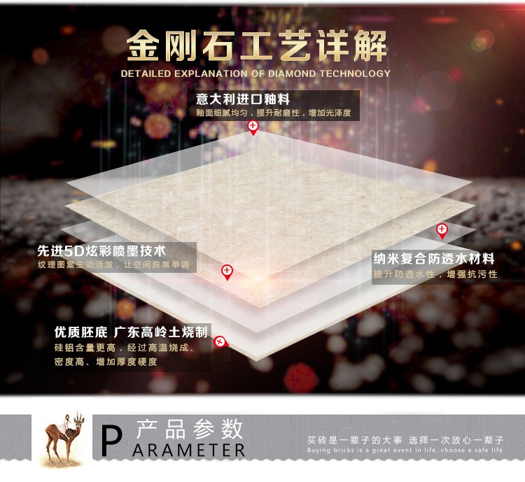 金曼古瓷磚廠家特價金剛石因高品質(zhì)而得名,是一款極具天然石材效果和微晶石質(zhì)感的仿石材瓷磚,它不但在價格、環(huán)保、耐用和清潔上極具優(yōu)勢,在質(zhì)感、規(guī)格、花色、重量等指標上,金剛石都遠遠勝于石材、拋光磚。相比其他種類的產(chǎn)品,它最大的特點可以用“高亮度、高耐磨、高平整、高逼真、高清晰、高環(huán)?!?。