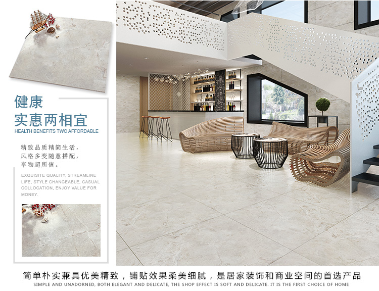 柔光瓷磚是磚面反射介于強(qiáng)光與弱光之間的一類瓷磚,其結(jié)合亮光類瓷磚的高調(diào)明艷裝飾和啞光類瓷磚的低調(diào)內(nèi)斂搭配效果,通過(guò)動(dòng)態(tài)柔光蠟拋技術(shù),降低產(chǎn)品反光率,從而達(dá)到人體舒適的視覺感受以及無(wú)光污染的空間裝飾效果。優(yōu)點(diǎn):1.視覺舒適,無(wú)光污染 2.堅(jiān)固耐磨,不易刮花.