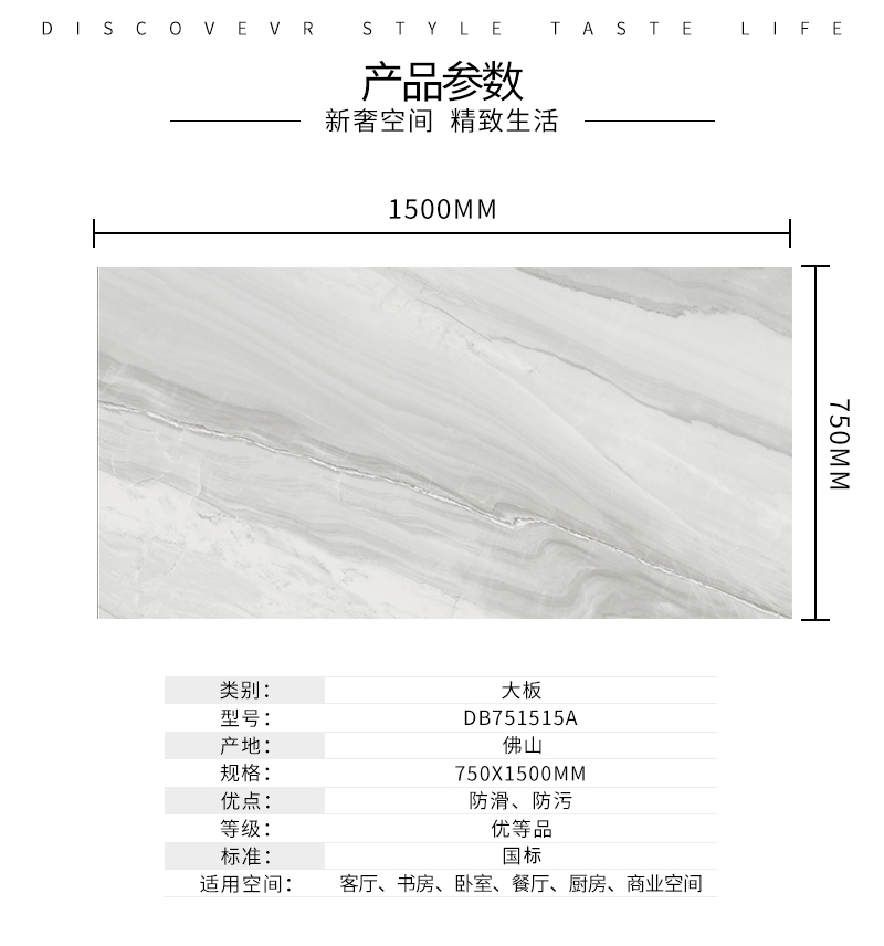 大規(guī)格瓷磚(DB751515A)-工程瓷磚 金曼古大規(guī)格瓷磚引進世界最先進的超大型壓機自動壓制而成,具有超大規(guī)格,超高硬度,超高致密度,超長時間煅燒,超低吸水率,超高光澤度。其磚面紋理流暢自然,效果逼真,適用于大型工程外墻干掛和酒店、商場、各辦公樓大堂等地面裝修