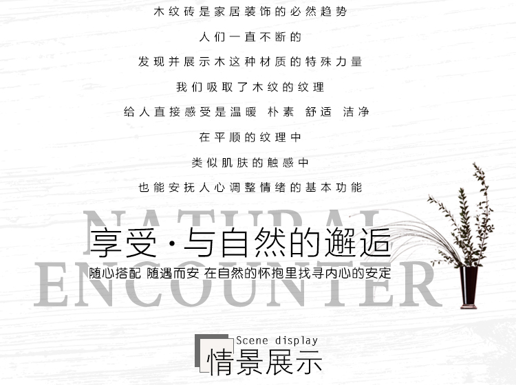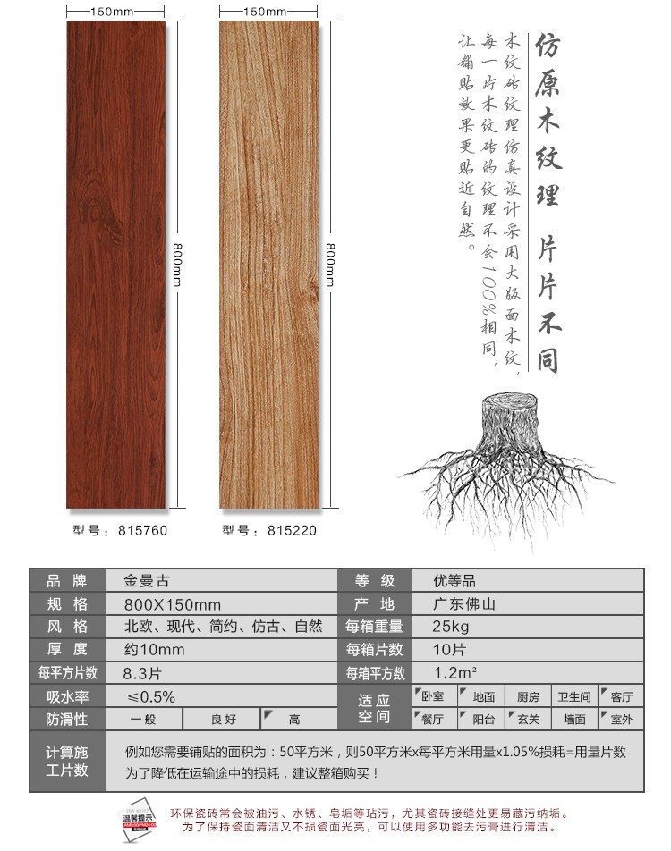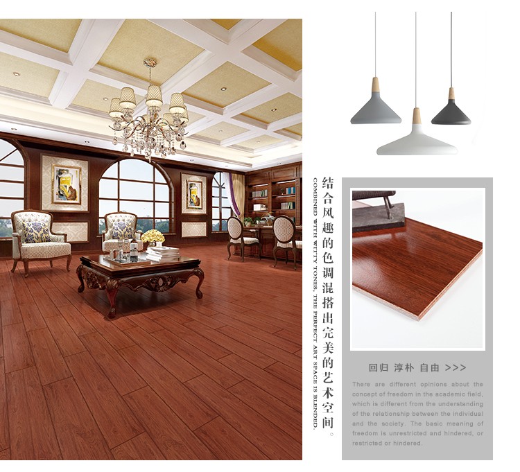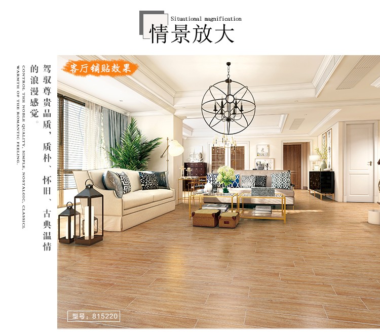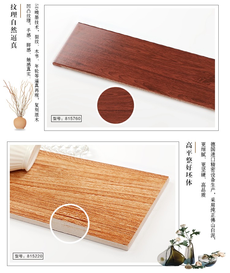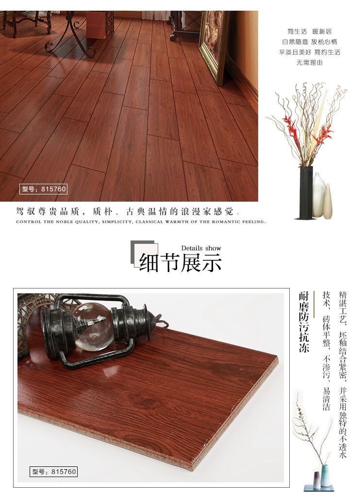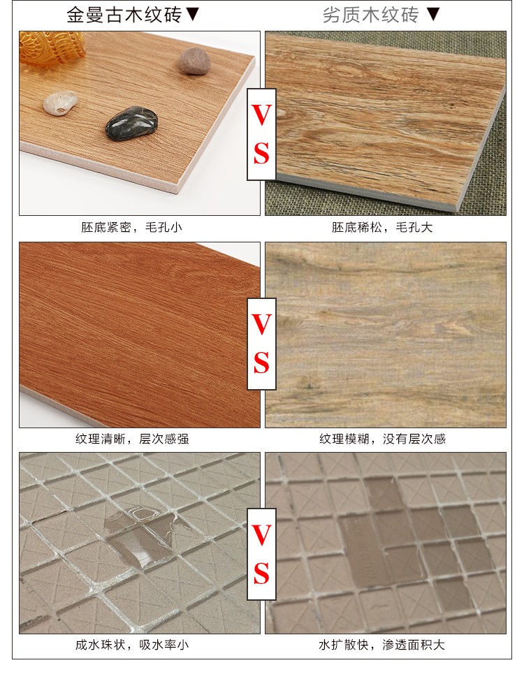 金曼古木紋磚,是一種表面呈現(xiàn)木紋裝飾圖案的環(huán)保建材.紋路逼真、自然樸實(shí)、沒有木地板褪色、不耐磨等缺點(diǎn);曼古陶瓷木紋磚系列線條明快,圖案清晰為特色。本身具有阻燃,不腐蝕的特點(diǎn),綠色、環(huán)保型建材;產(chǎn)品使用壽命長,耐磨,無需像木制產(chǎn)品那樣周期性地打蠟保養(yǎng)等.